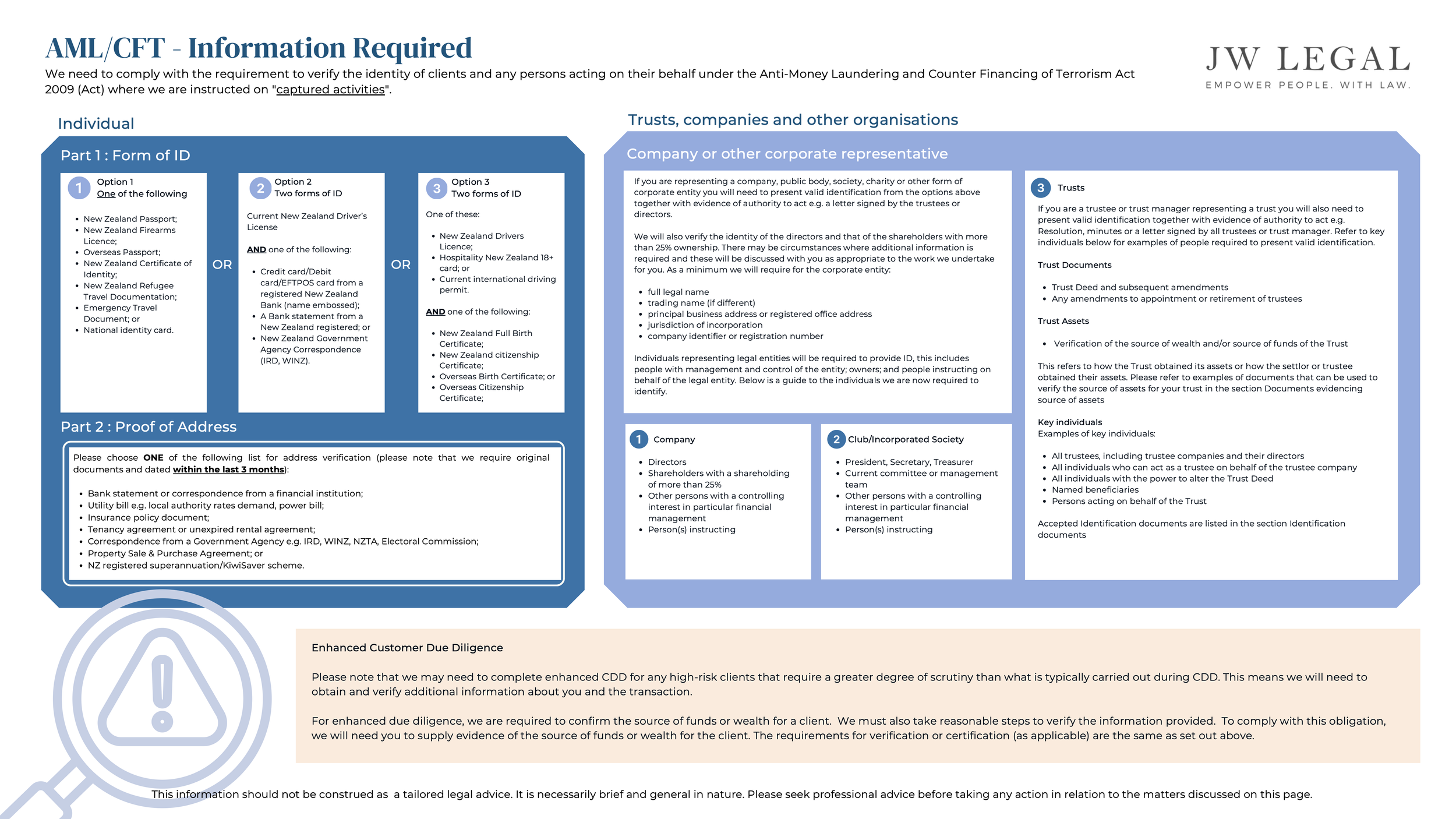 In situations where our clients are trusts or companies or other similar bodies corporate, the AML/CFT Act will require us to obtain CDD information about the key parties associated with those entities (such as key shareholders, directors, trustees, settlors and certain beneficiaries). You can find more information about individual identification documents and our guidance for trusts/companies/other organisations the chart at the bottom this page.