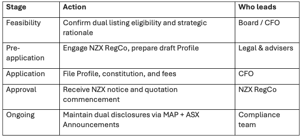 Exit or transition planning: If the issuer later seeks a full NZX listing or de-listing, early discussion with NZX helps to manage timing and disclosure continuity.