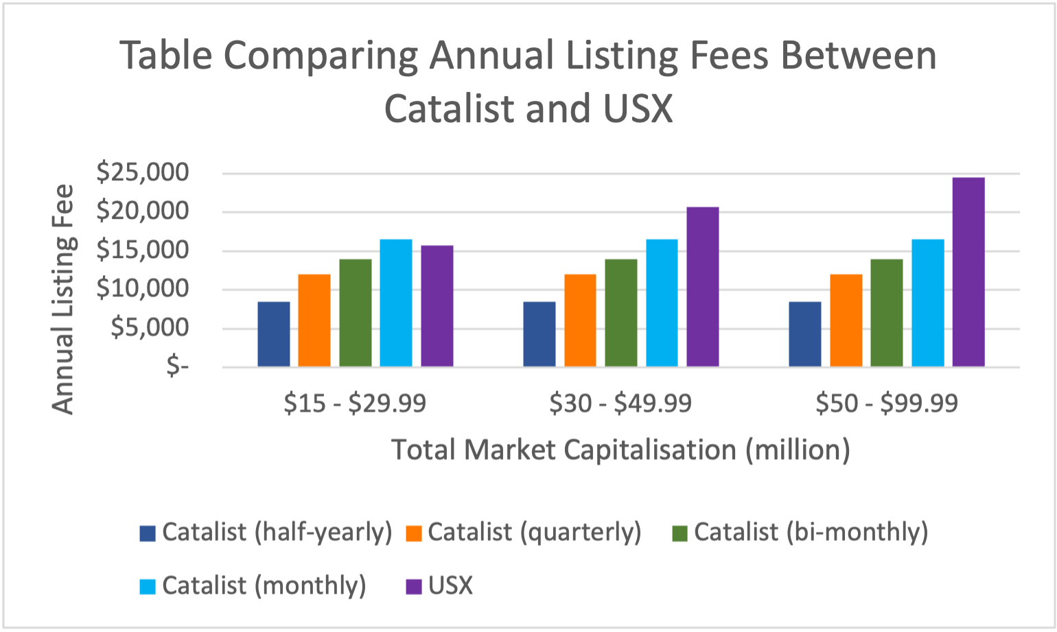 Catalist’s fee structure is based on the number of trading events a company holds each year. The total listing cost is between $5,000 and $16,500, depending on the total number of trading events. There is an initial listing fee of $5,000. USX charges issuers based on their market capitalisations, regardless of trading activity. The annual fee starts at $4,740 for issuers under $2 million market capitalisation and up to $50,000 for larger issuers.
