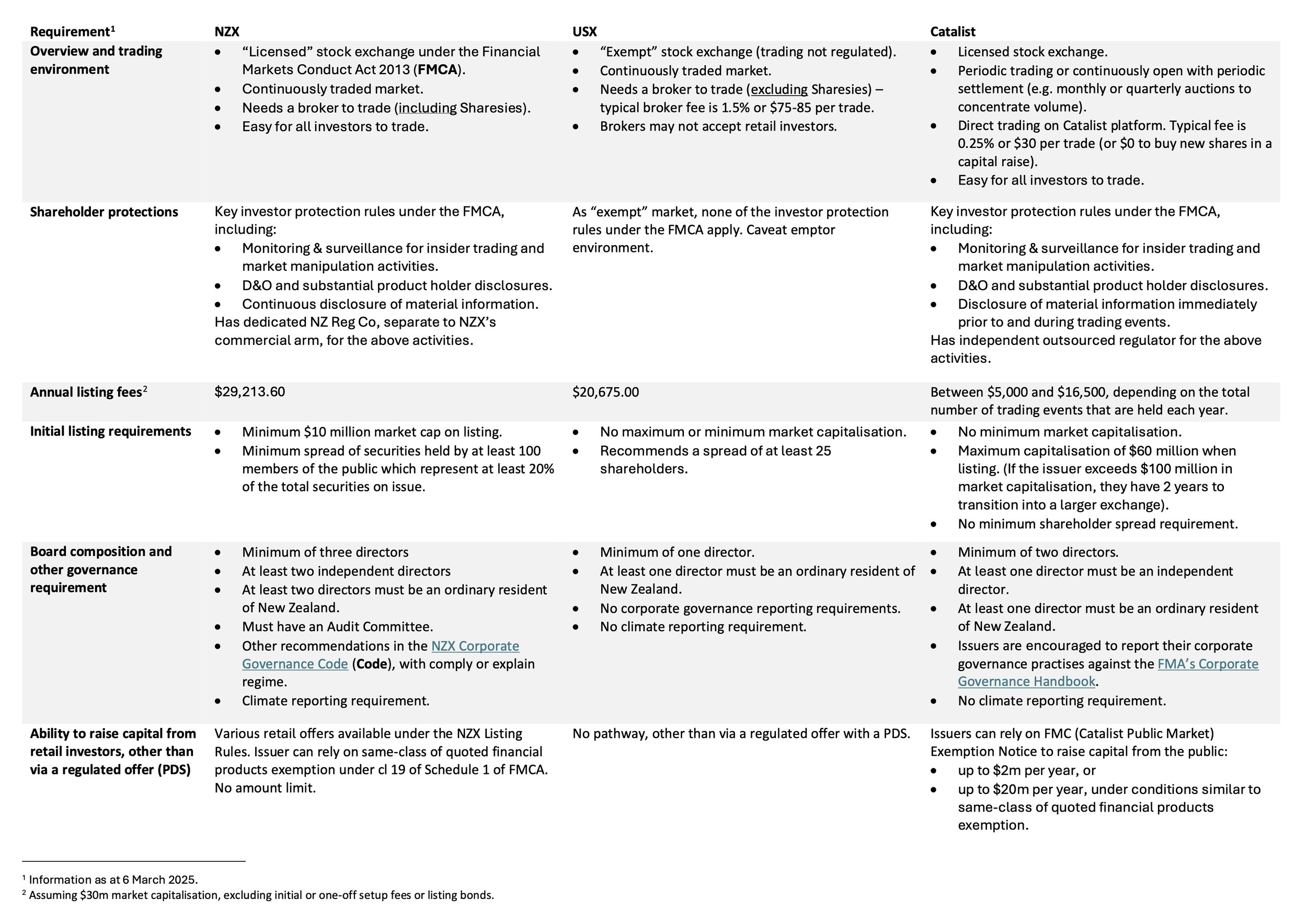 Catalist and USX both offer alternative listing venues for companies delisting from the NZX, but their suitability depends on a company’s priorities, including potentially relisting on the NZX. USX provides a broker-based trading platform with minimal governance requirements, making it a familiar option for companies focused on maintaining a listing with low regulatory overhead. Catalist, on the other hand, facilitates direct investor access and streamlined capital raising under regulatory exemptions, with theoretically improved liquidity, making it more attractive for companies potentially seeking future retail investor participation. Both exchanges offer minimal governance requirements, and there are some listing cost differences but they do not appear major. Directors should weigh factors like liquidity, compliance costs, capital-raising needs, and potential for a relisting on the NZX and/or other positive liquidity events when choosing the best market for their company’s future.